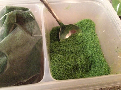 Scenic scatter is rather hard to describe. It looks like powder paint, but feels a little more ‘fuzzy’ than that. On returning home I mixed the two colours 50/50 in a container. That isn’t the best picture in the world above, but if you look carefully – just in the top right of the picture – you’ll see the bag of light green scatter which has been mixed together with the dark green on the left.