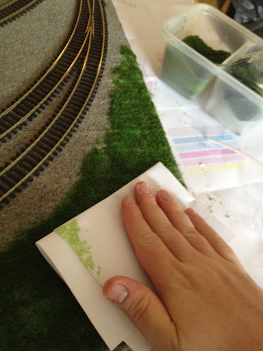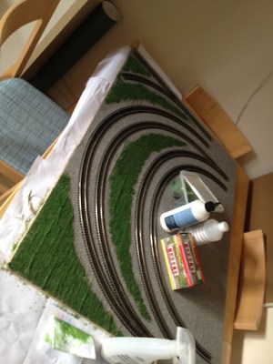 I let the test section dry over night and once I was happy that nothing had gone terribly wrong I went ahead and continued to add green elsewhere on the layout. It might be worth having a small piece of wood with a section of track nailed down to for these testing purposes. However I don’t have such piece of small wood so this is why I just used a small section of the layout for my scenic test.