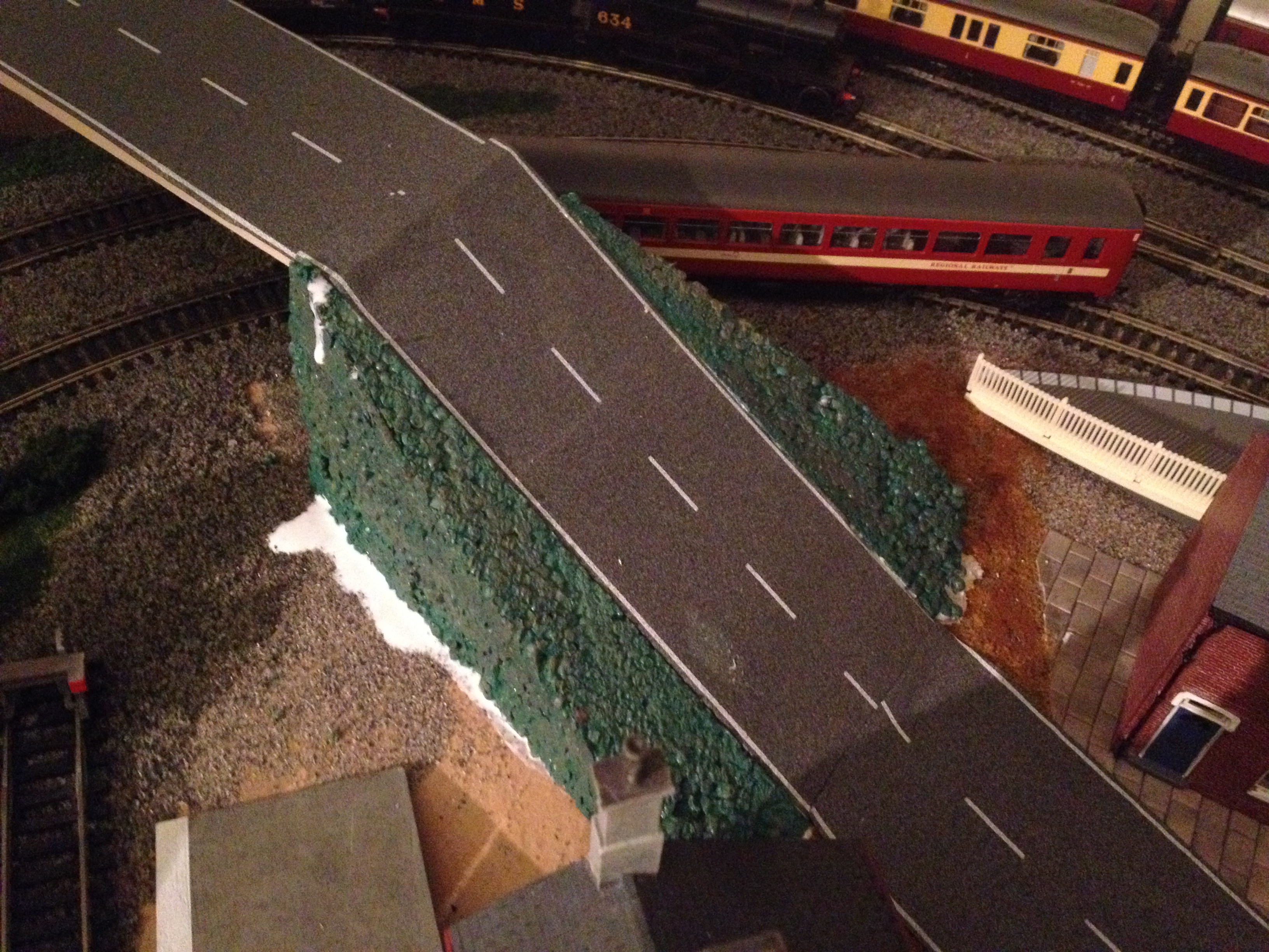 It has long been my intention to add in some ‘height interest.’ Let me explain… If I was going to start again from scratch I’d hide half the layout behind some scenery, a wall or hill perhaps. Trains would disappear behind such a wall and reappear elsewhere which would look visually more realistic than being able to see the full oval. This after all is how many modellers design their layouts.