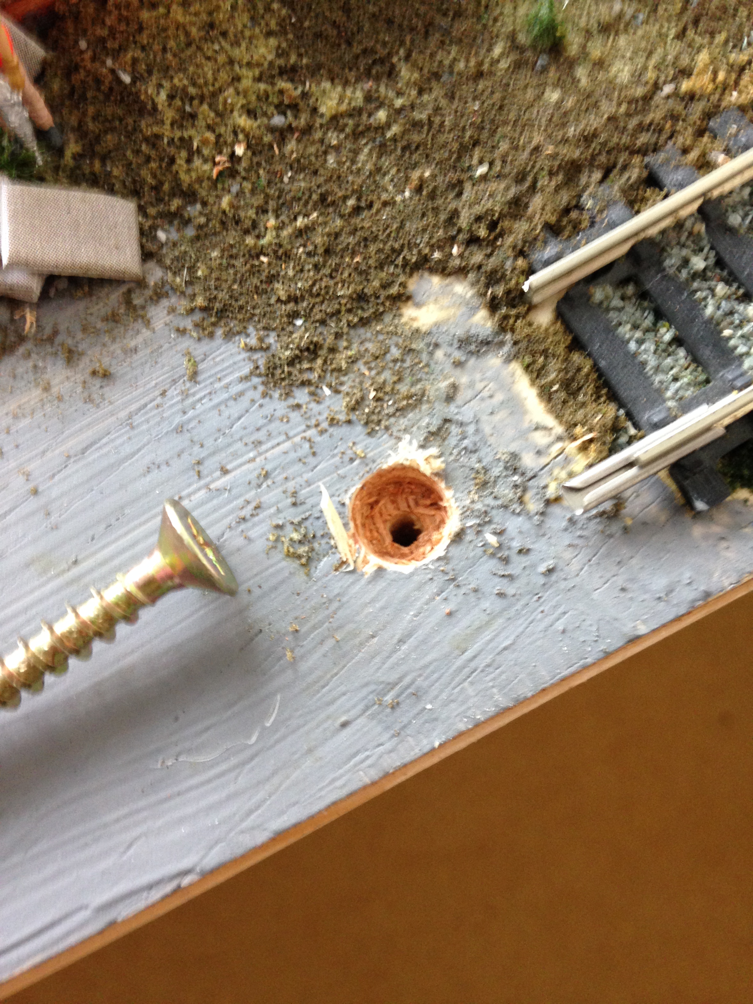 …It’s also worth making the top of this hole slightly bigger using a large drill bit so the screws sit flush with the board when they are fully inserted…like so…