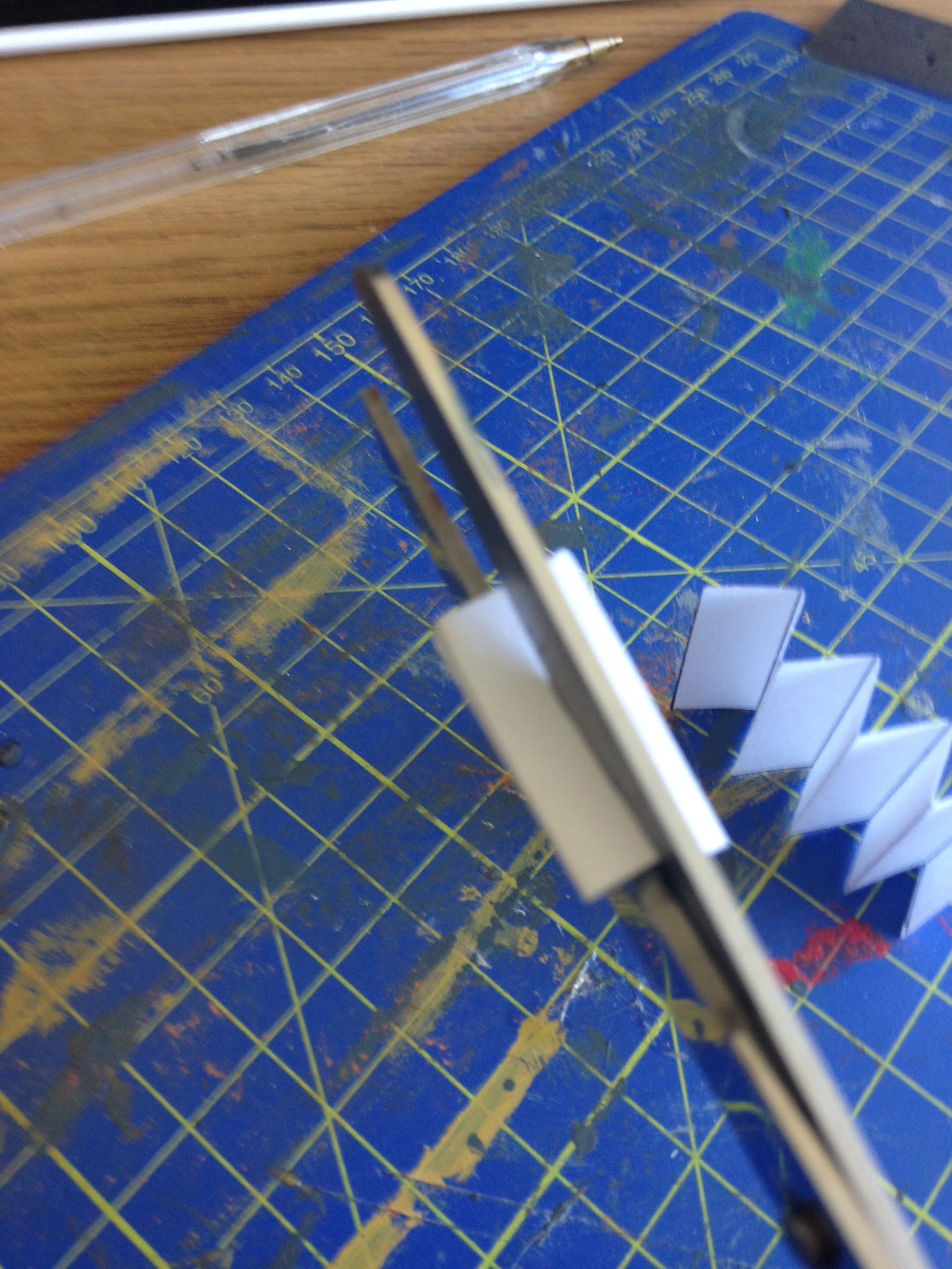 Instead of a full concertina of 8 panels, I’ve made two separate 4 panel concertinas for each coach. I’ve then fixed a piece of plasticard (this can be painted later) to each end to complete the look…