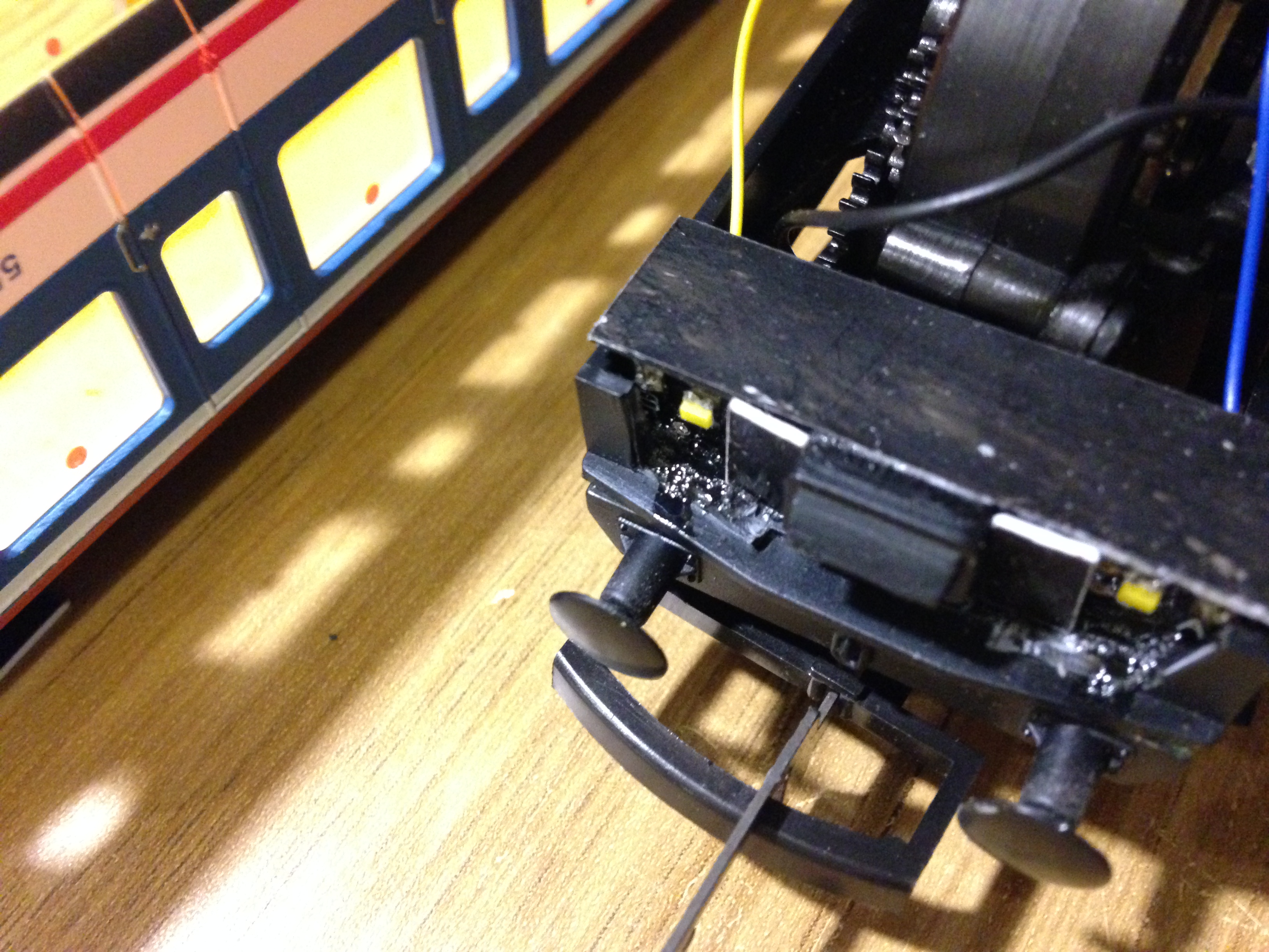 Two metal strips attached to the underside of a piece of bread board have to make contact with the wheels to power the lights. The instructions therefore tell you to fit the whole board to the bogie. This proved to be a problem as the bread board was too wide. In the end I managed to reduce the width of the bread board and re-solder the contacts to it, and now it fits nice and snug.