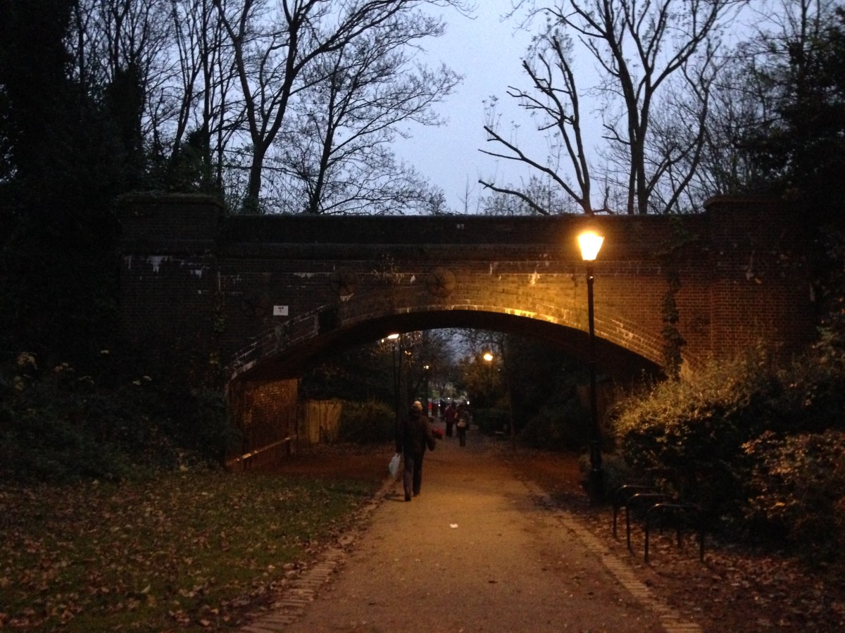 Nearly There Published December 2, 2014 at 3264 × 2448 in Exploration: The Northern Heights ← Previous Next → We’re approaching our destination now and the light is slowly fading. The original track bed has now become inaccessible but it’s still certainly visible. This short bridge is seen on the approach to Alexandra Palace Station.