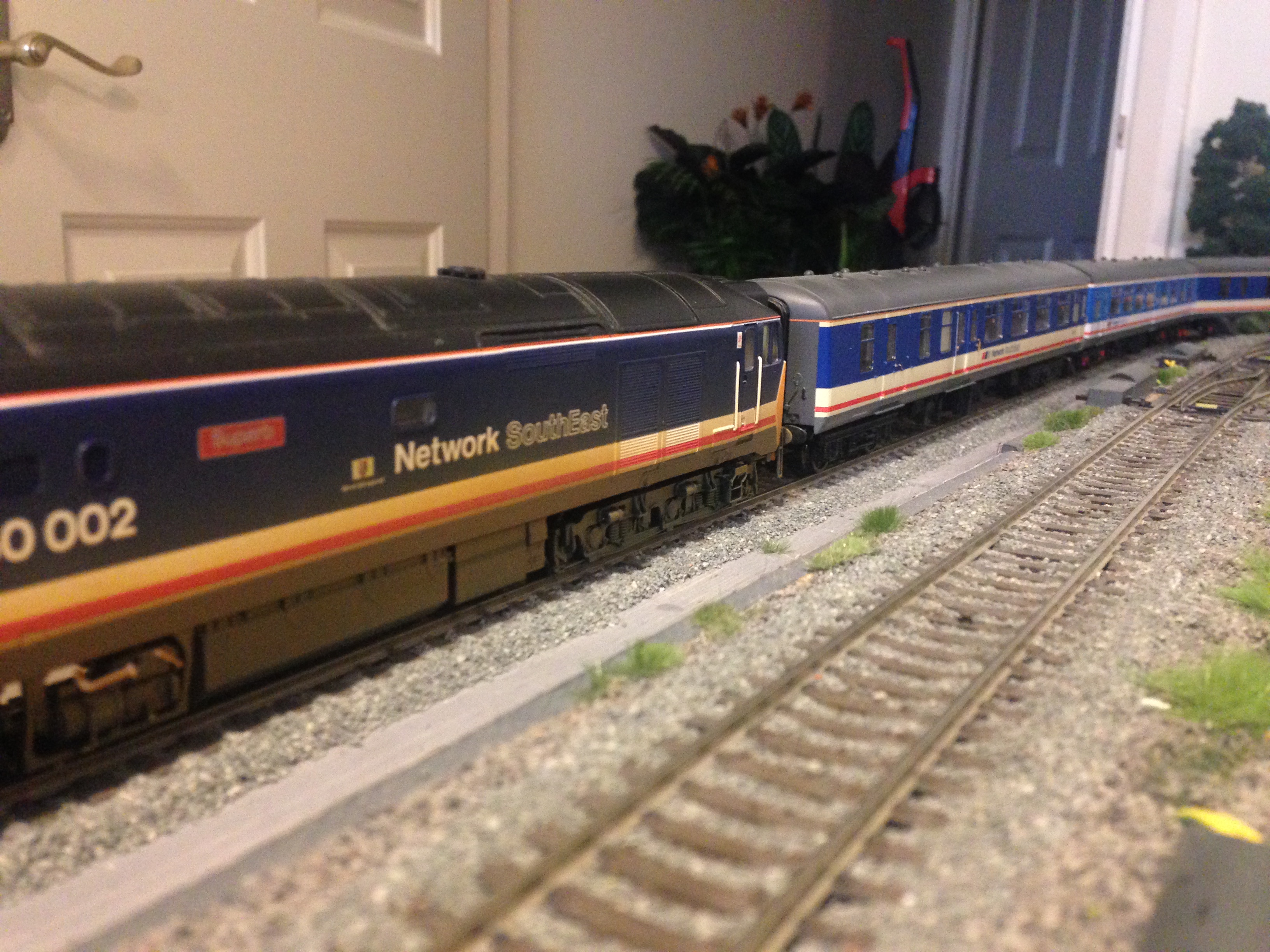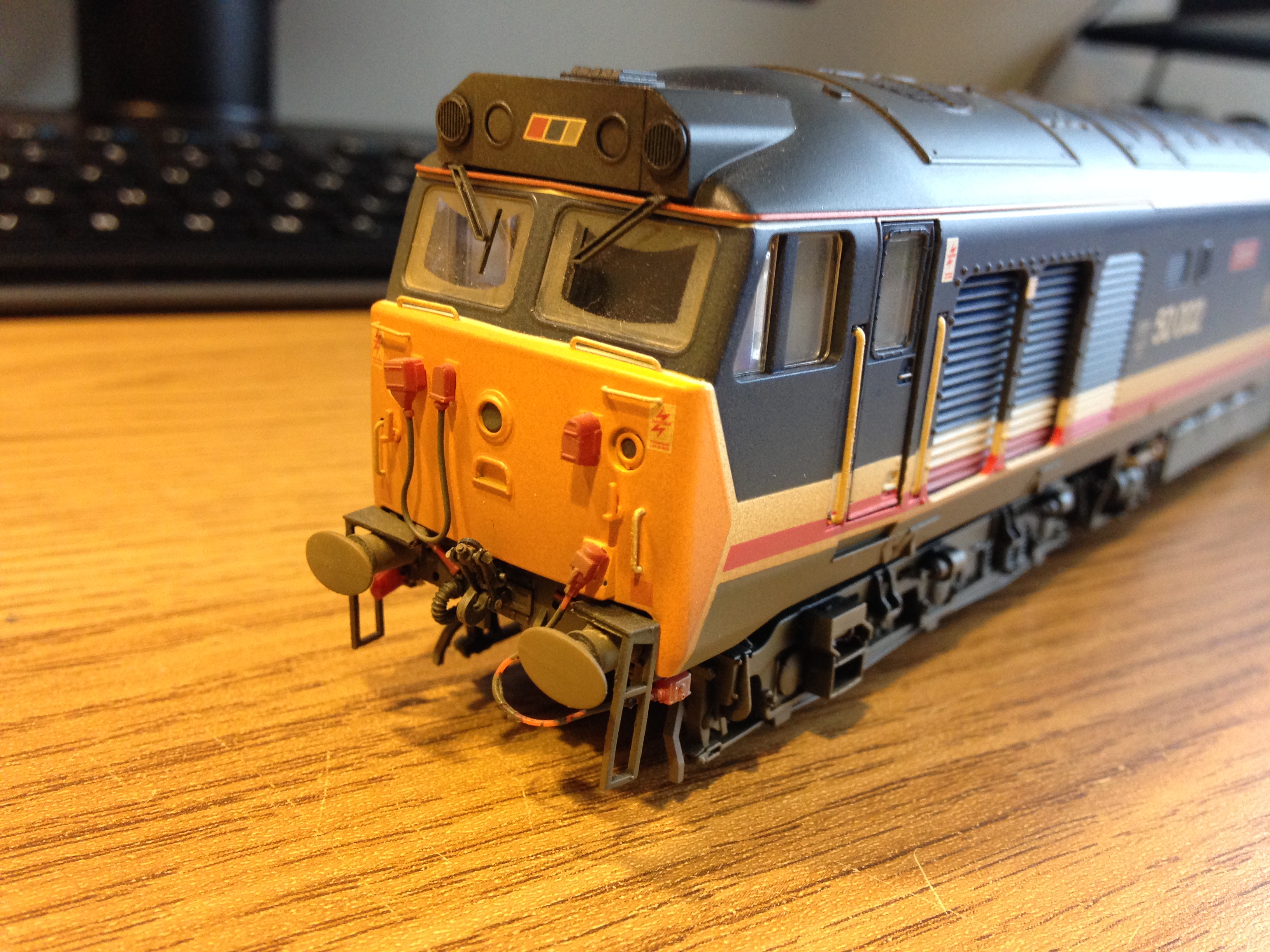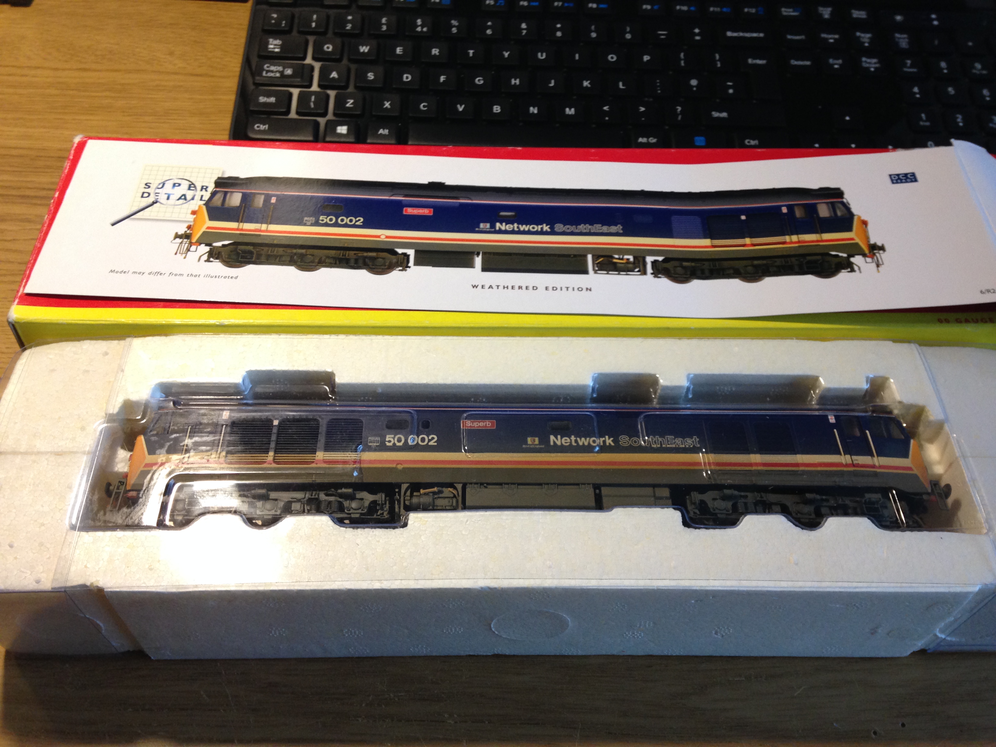 Hornby run the monopoly on Class 50’s and make, or rather made, a few flavours: BR Blue, BR Blue Large Logo & Yellow Cab, and the one I’ve picked up, Network SouthEast. (Probably my all time favourite livery). Variants available pristine or weathered, of which mine is the later. They also made a limited edition run of RailFreight Sector versions and I’ve also seen some in Civil Engineers ‘Dutch’ Grey/Yellow (fitted with sound).