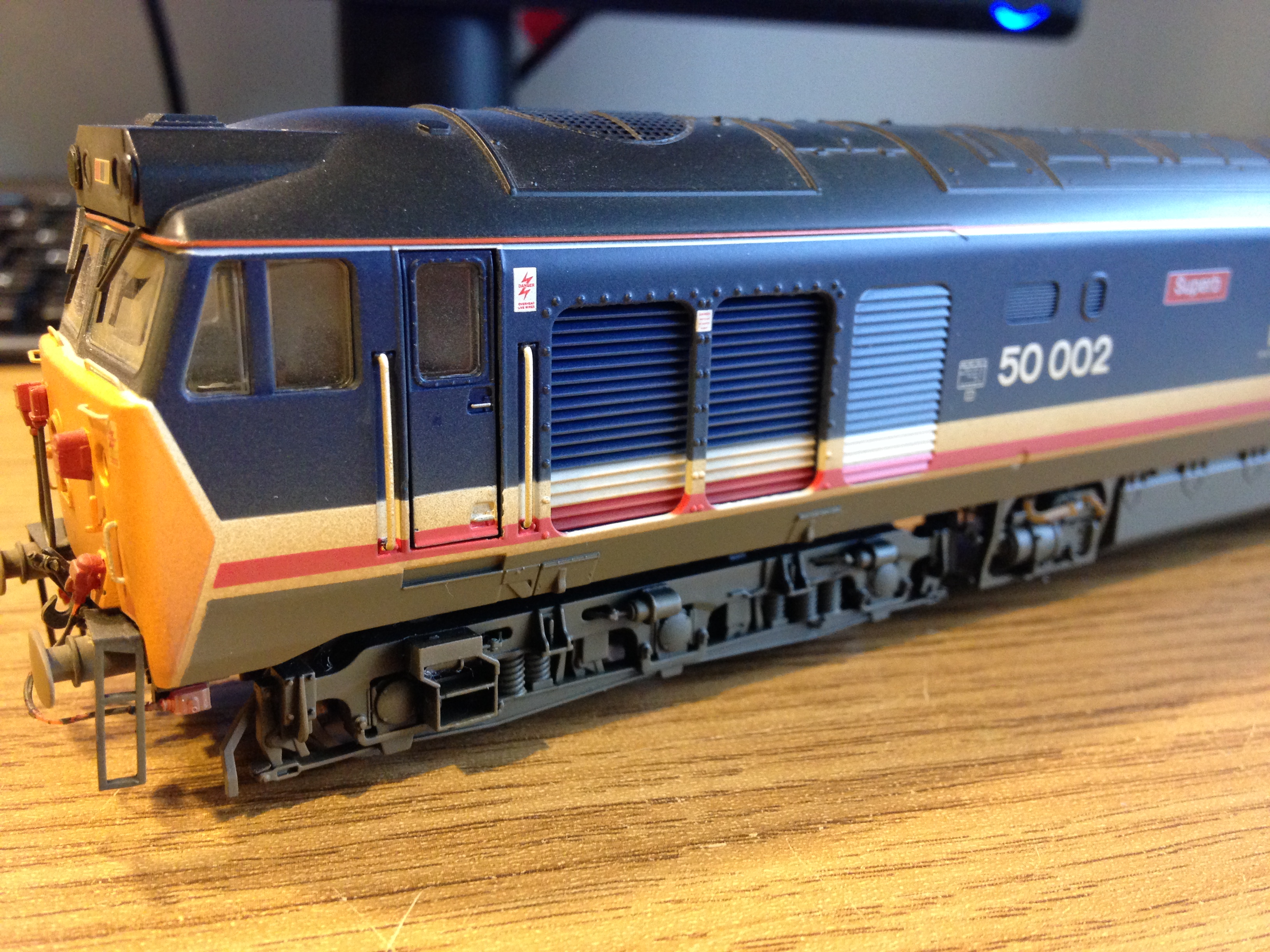 Moving down the side of the loco and the detail doesn’t stop: The handrails are again individually painted and recessed. Rivets highlight and frame the engine bay vents and there are fuel caps and hatches in the right places. The loco running number 50 002 is applied in a suitable font size along with the iconic NSE type face and West of England logo. The name plate, ‘Superb‘ is a transfer. Nowerdays you might be lucky enough to get an etched plate (like the Class 67 for example) but when this model was released this was not the norm so I can certainly live without it.