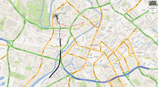From the south, a line diverges from the viaduct of the former London Midland lines into Manchester Central & through routes to Piccadilly and Yorkshire. It runs northwards over the River Irwell and dips underneath the Manchester to Liverpool line most likely in the place of the A6042. Tunnelling under Ordsall Lane and Chapel Street, the line arrives in the industrialised Blackfirars/Eastern Salford area of the city, just to the north of St Phillip’s Church. The station would probably sit in the spot the University of Salford’s Centenary Building now occupies. A link line may also exist feeding into Victoria towards the north and east of the city.
