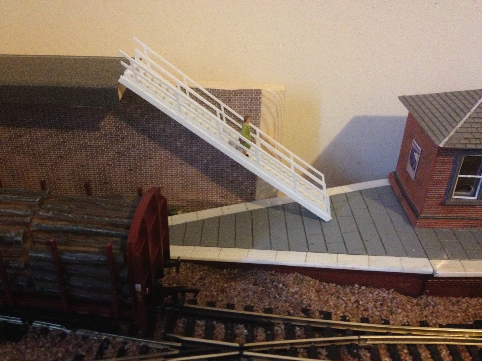 The reverse shot showing pedestrian walkway towards the station. You can also see the area above the signal cabin which still needs some scenic scatter adding. I am wondering if the station starter semaphore (left) may be slightly too high and ‘out of scale’ with the rest of the model, particularly compared to the car pictured… Perhaps I will move it down eventually.