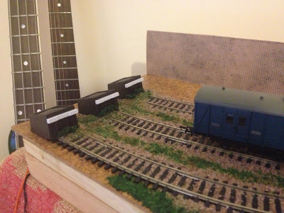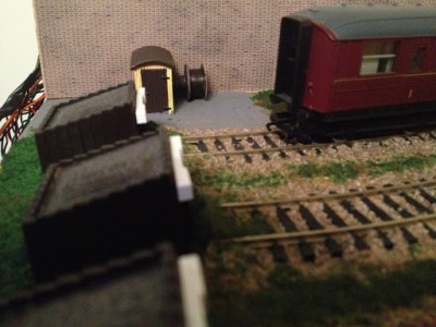 To the left of the road bridge I’ve completed the laying of scenic scatter. The only area remaining in need of scenic scatter is seen to the right of the signal box (above top). This is because I’m waiting to add some maintenance steps on order from gaugemaster. I’ve added another small patch of painted road next to the headshunts, this plot also features a small shed with some wire drums stacked next to it. (See bellow).