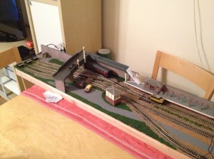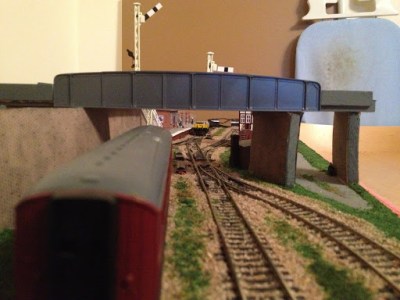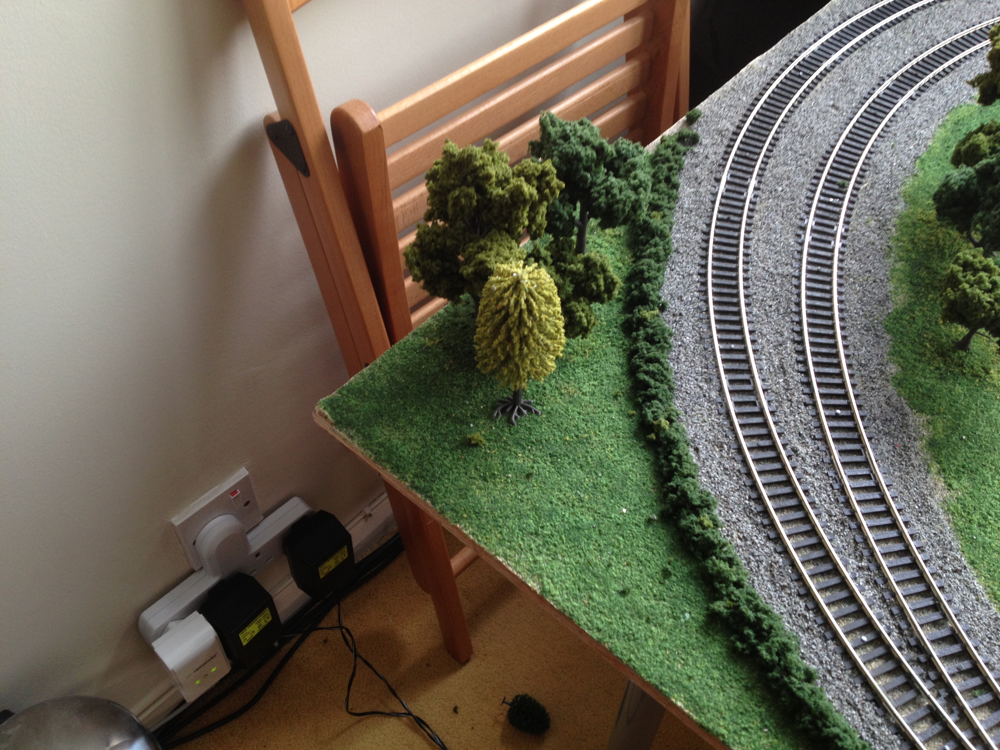It’s hard to spot in the picture above but at the rear of the layout the oval runs on the old boards and at the front it drops down and runs on the new woodwork. This means either side must accommodate a modest gradient to raise and the lower the line between the sections. Continue reading