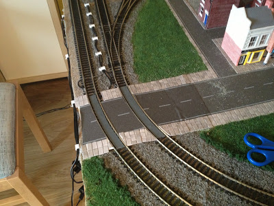 Take a spare piece of track that matches the curve radius you are trying to mark out. Turn it upside down and then you can mark where the rail touches the plastic. This will in turn create three pieces: One piece to fit outside of either rail and one piece to fit inside (this will need to be trimmed so the wheels do not touch it). Put these in place and keep making sure a variety of rolling stock will run over it with no faults. Once you’re happy you can stick it down as I have above. I’ve then started to stick roadway and pavement down.