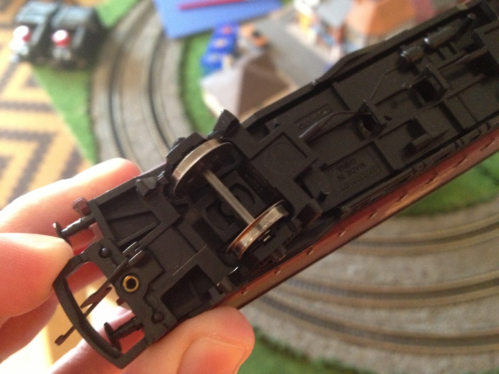 Remember these? Well I have a set of three, and in certain scenarios they are a real problem child going over the aforementioned points. Being pulled – they’re not a problem – and I think this is because the loco or next wagon is providing some guidance. However when shunted/pushed the lead wheels tend to slip up and over the frog (this is the ‘V’ shape made by the adjoining rails).