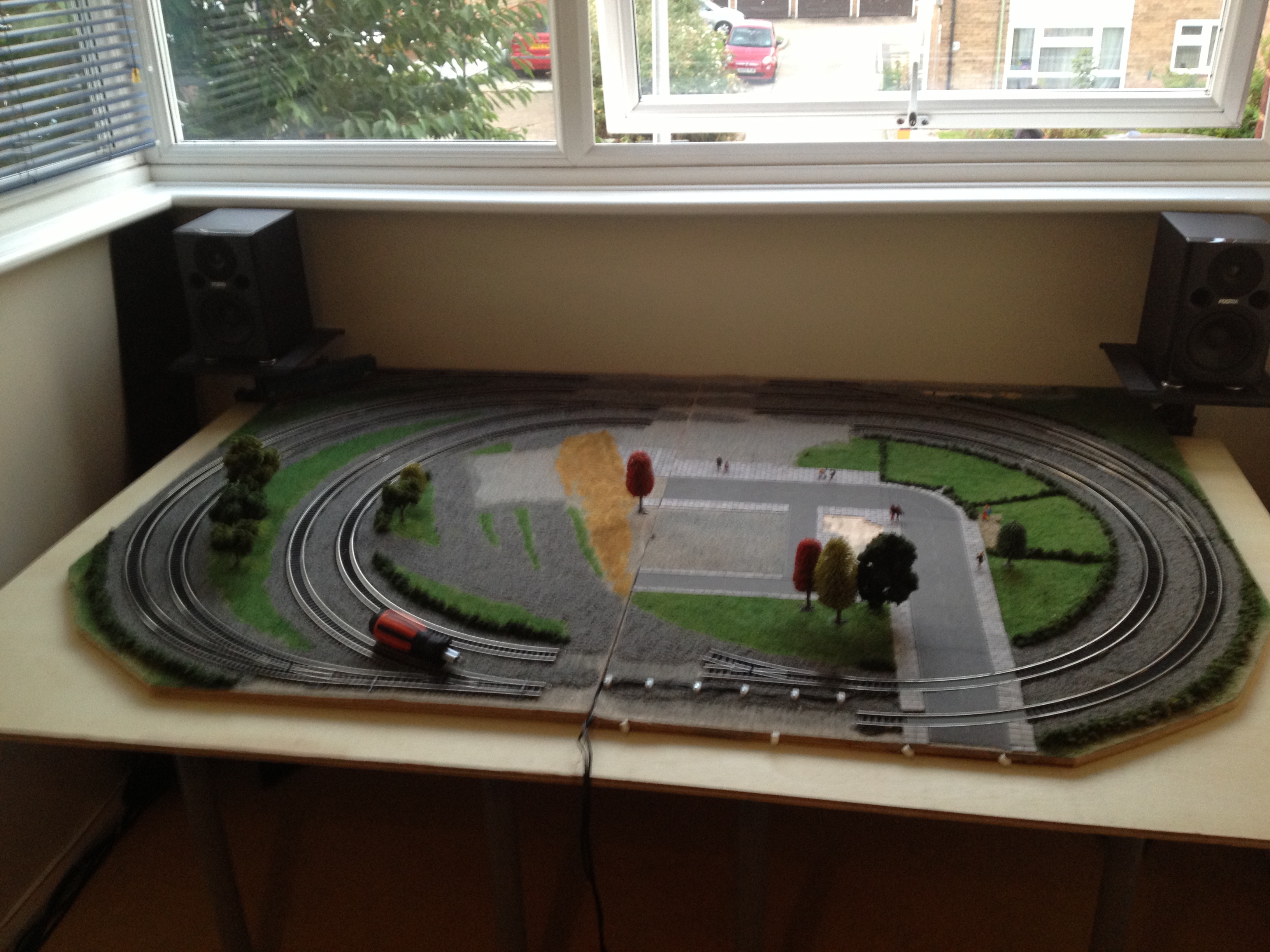 No major track work will need to be done, it’s just a case of adding another straight to each oval. It will be slightly fiddly to plug the scenic gap but nothing too difficult. The major problem with this plan is the two speaker stands at the back of the room. Currently the baseboard nestles snugly in between them both and are flush against the back wall maximising space. If I were to separate the two boards to add a new piece I’d either have to move the speaker stands completely, or, bring the entire layout forward (and off the back wall) to accommodate the expansion. I don’t like the sound of either of those two plans.