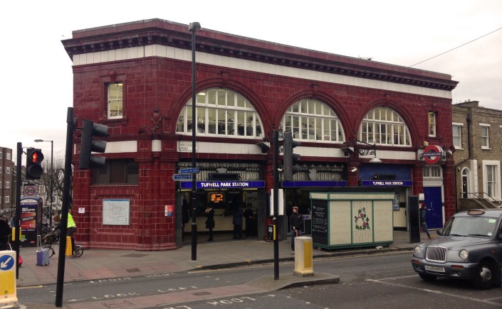 Green designed the stations in a bold uniform ‘Arts & Crafts’ style so that they would be instantly recognisable for the UERL’s new customers. Each station was constructed around a steel two story frame, with ox-blood red tiled façades with large semi-circular windows above wide entrance/exit gates. This December (2014) I went to take a closer look at some of the examples surviving on today’s Northern Line.
